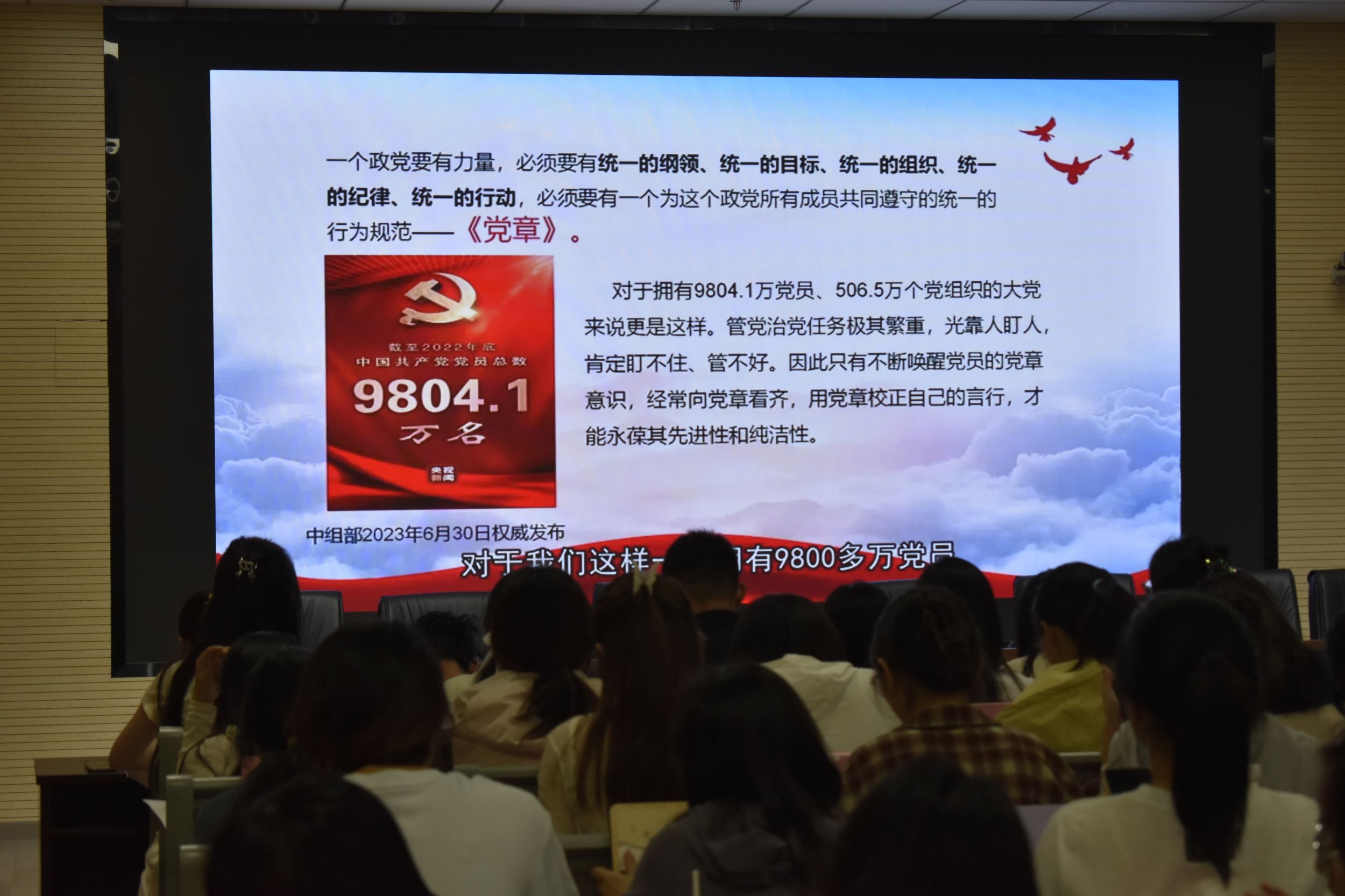 随后,全体学员集体观看《党课开讲啦》和《榜样9》专题节目,在泛黄胶片与4K修复画面的时空对话中,见证党章从石库门到天安门的演变传奇,了解《中国共产党章程》的演变历程,了解优秀党员的突出事迹,深刻理解党员的先锋模范作用。