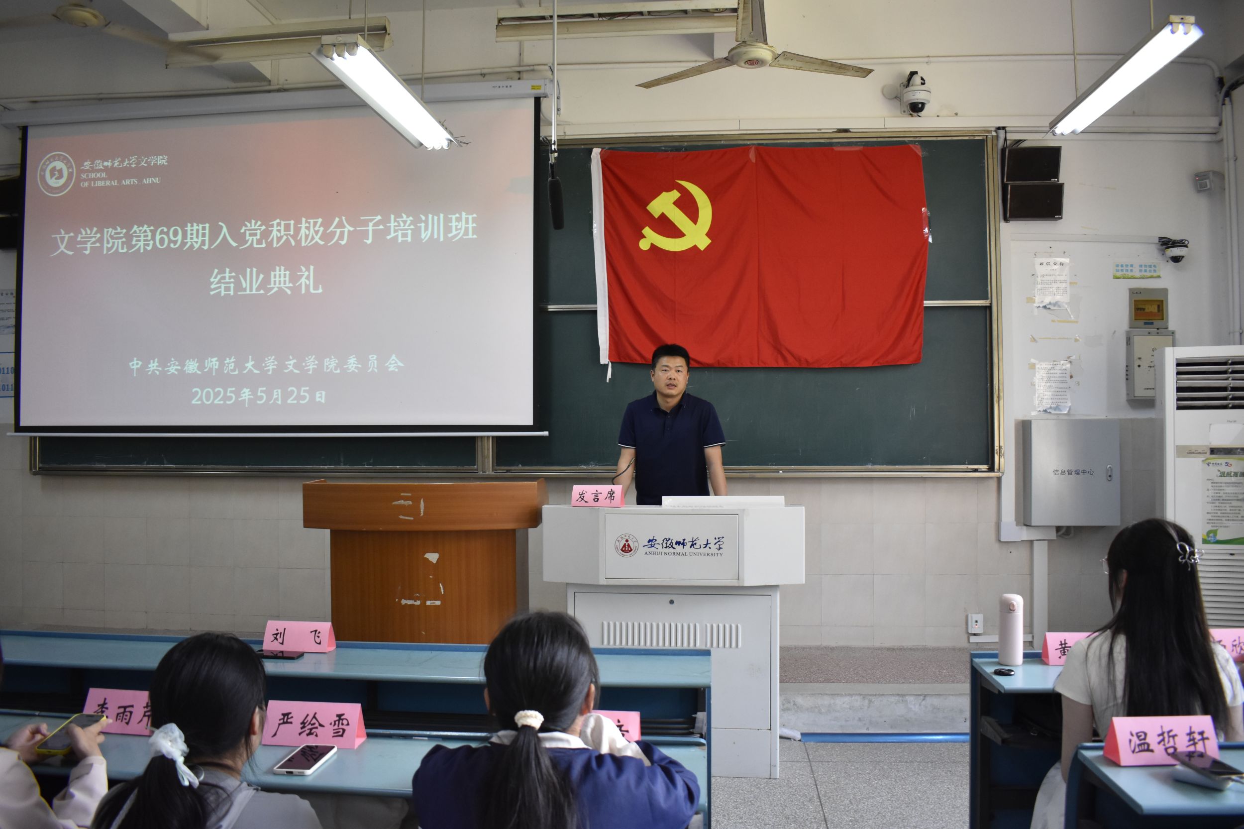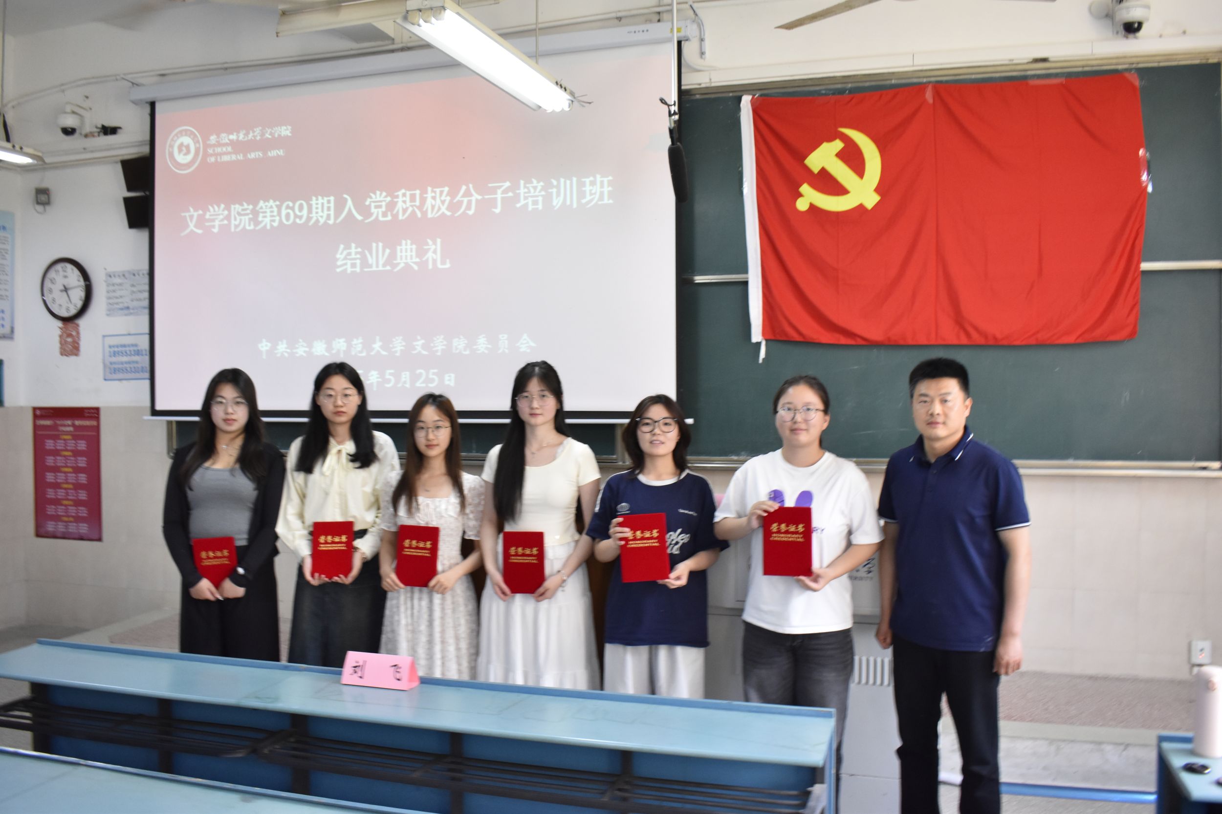 5月25日下午,本期培训班举行结业考试和结业典礼。结业典礼上,各小组代表分享学习心得、实践感悟,表达向党组织靠拢的决心。刘飞应邀出席为本次培训班优秀学员颁发荣誉证书,并做总结发言,他勉励学员以培训为起点,加强学习、知行合一、发挥先锋模范作用。结业典礼在激昂的《国际歌》中落下帷幕。本期培训班通过专题授课、视频教学、实践研学等多元化形式,引导学员们筑牢信仰之基、补足精神之钙,把稳思想之舵。参训学员纷纷表示,将把培训所得转化为奋进动力,在专业学习、社会实践、志愿服务中争当先锋,让青春在党旗下绽放绚丽之花。
