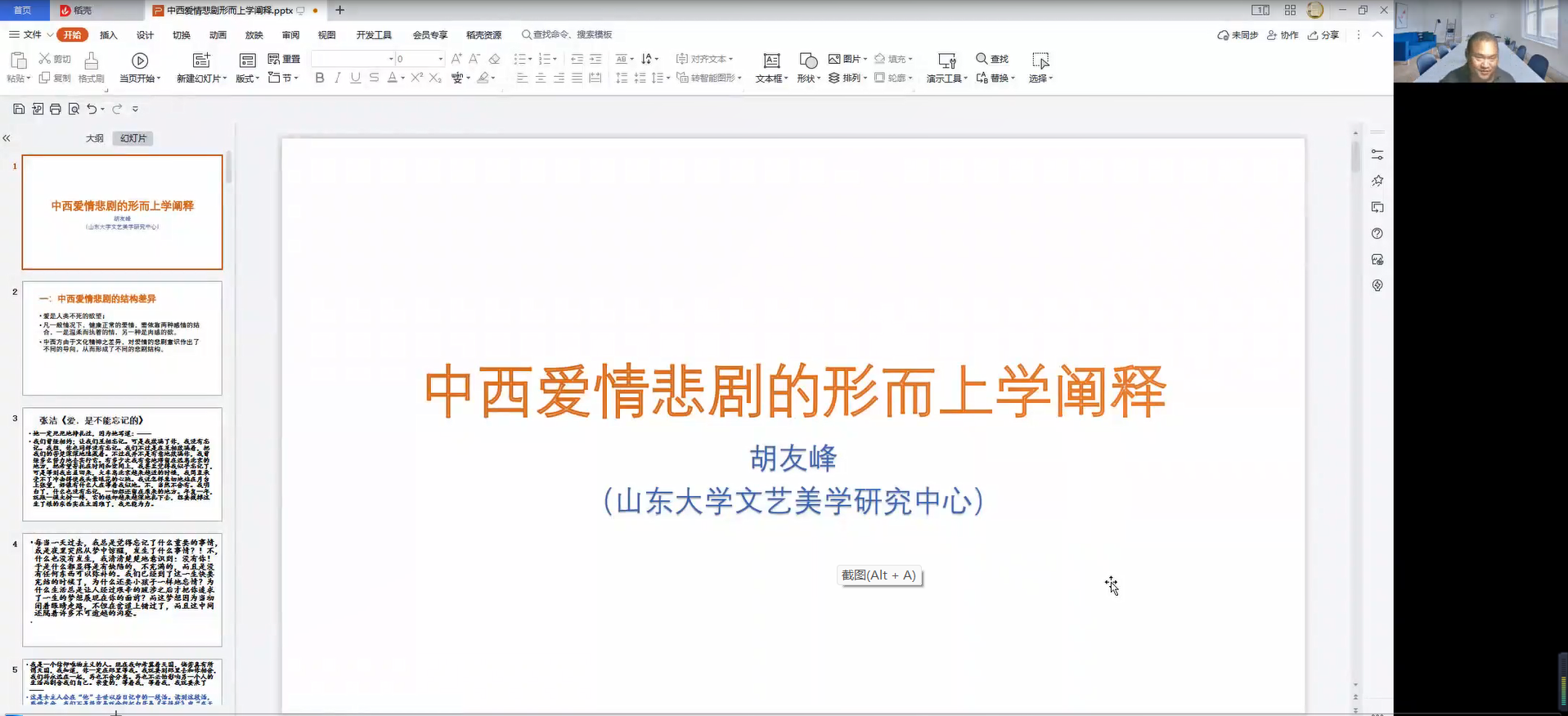 胡友峰教授上手即高屋建瓴地指出,爱是人类追求不死的欲望(爱欲),进一步可上升为“友爱”,最终臻于至高境界“神(圣)爱”。中西方爱情的表现形式上的不同源于深层次的形而上学结构(中西方由于文化精神之差异,对爱情的悲剧意识做出了不同的导向,从而形成了不同的悲剧结构)。