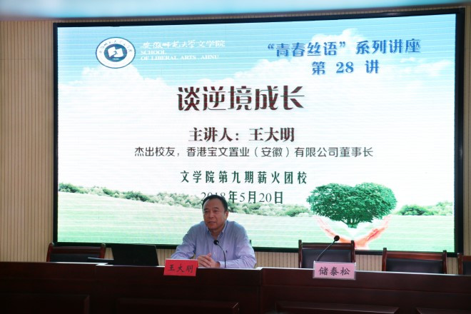 近日,365英国上市网站官网“青春丝语”系列讲座第28期在365英国上市网站官网行政楼三楼报告厅开讲。365英国上市网站官网杰出校友,香港宝文置业(安徽)有限公司董事长王大明先生应邀为同学们带来题为“谈逆境成长”的专题讲座。365英国上市网站官网党委书记余大芹,院长储泰松,辅导员赵静、汪旭,365英国上市网站官网第九期薪火团校全体学员及部分专业同学到场聆听。讲座由储泰松教授主持。