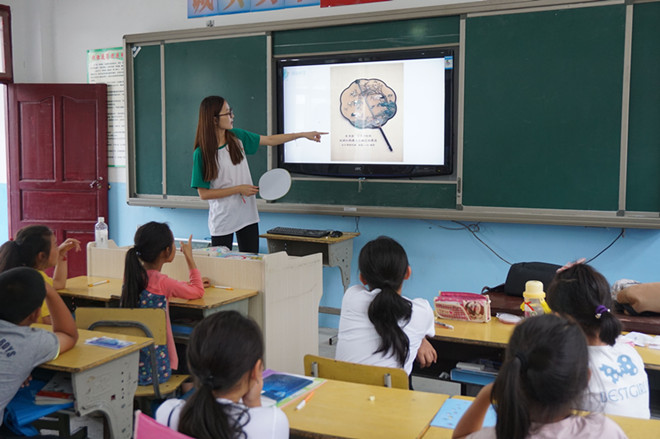 在团扇制作结束以后,小老师们还特意为学生举行了一场“团扇小小T台秀”,将每组设计完成的团扇成品做了集中展示和评比,使孩子收获了满满的幸福感和成就感。志愿者们将古老的团扇制作艺术与学生家乡自然风光结合起来,让学生在日常生活中发现家乡之美、自然之美,既有文化韵味,又有人情温度。
