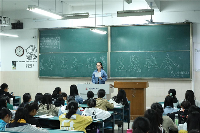 此次班会的顺利召开,使同学们能够更加清楚地认识到严格遵守国家法律法规和学校的各项规章制度的重要性和必要性,激励同学们把对个人理想的追求与社会紧密结合,把远大抱负落实到行动中去。心有规矩,自成方圆,在《学生手册》的指引下,同学们在今后学习与生活中会积极践行“厚德、重教、博学、笃行”的校训,遵守校纪校规,做文明有礼的汉教人、师大人。(文/徐秋玥 图/黄宇健)
